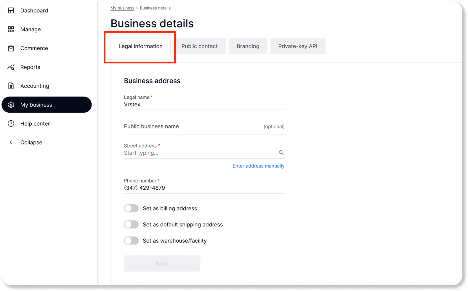 Navigate to My Business > Warehouse & facilities.