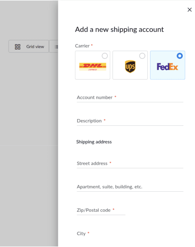 It will open the navigation drawer with the shipping account form for the various shipping companies.