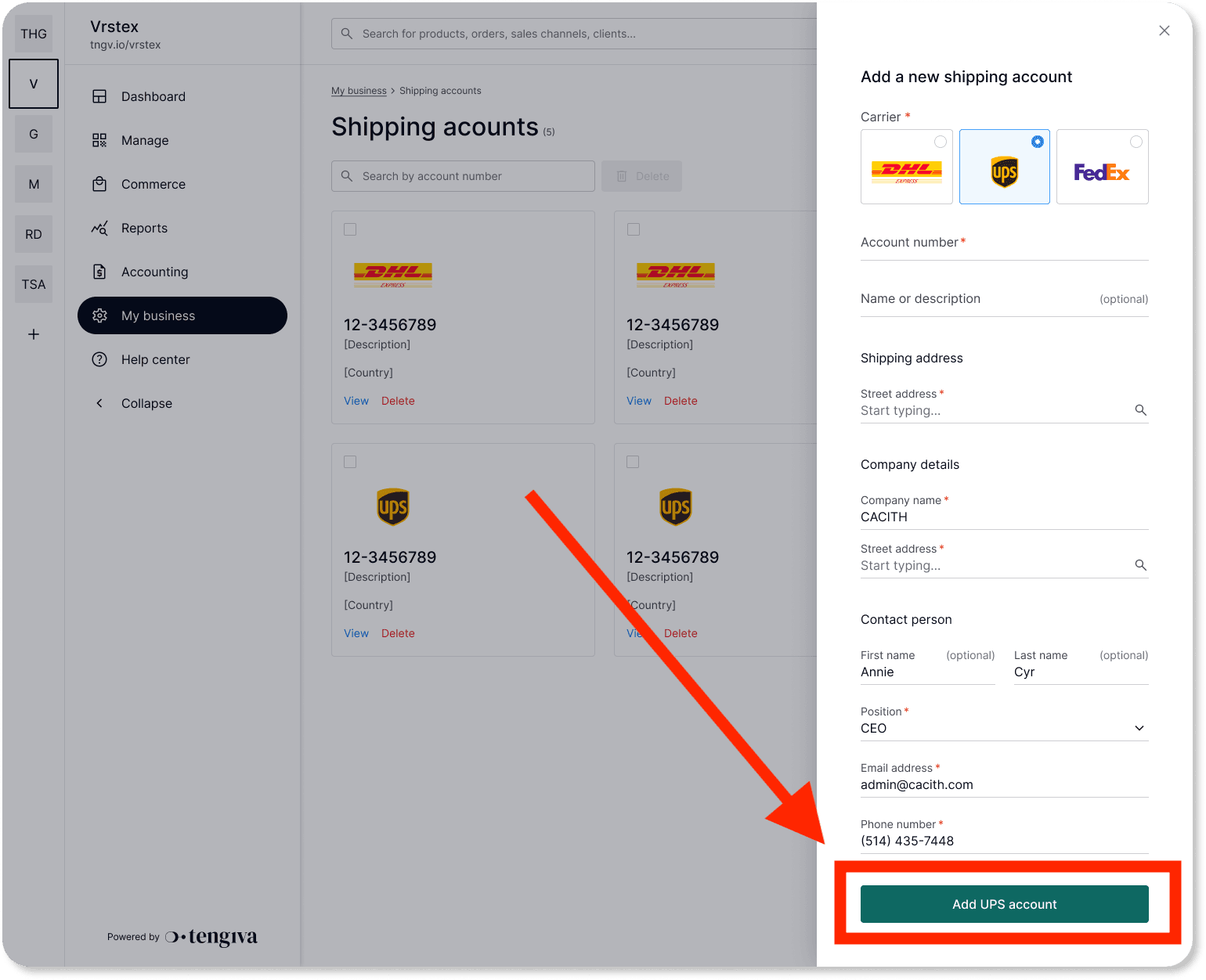 Navigate to My business > Shipping account |