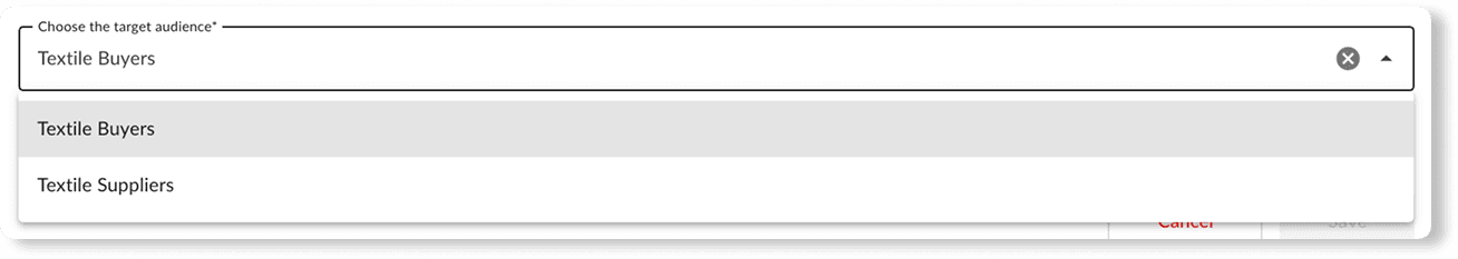 Categories include education, consulting, technologies, certifications, financing, testing laboratories, machinery, trade shows, media, events, and more. Services can be directed to a general audience of textile buyers and textile suppliers.