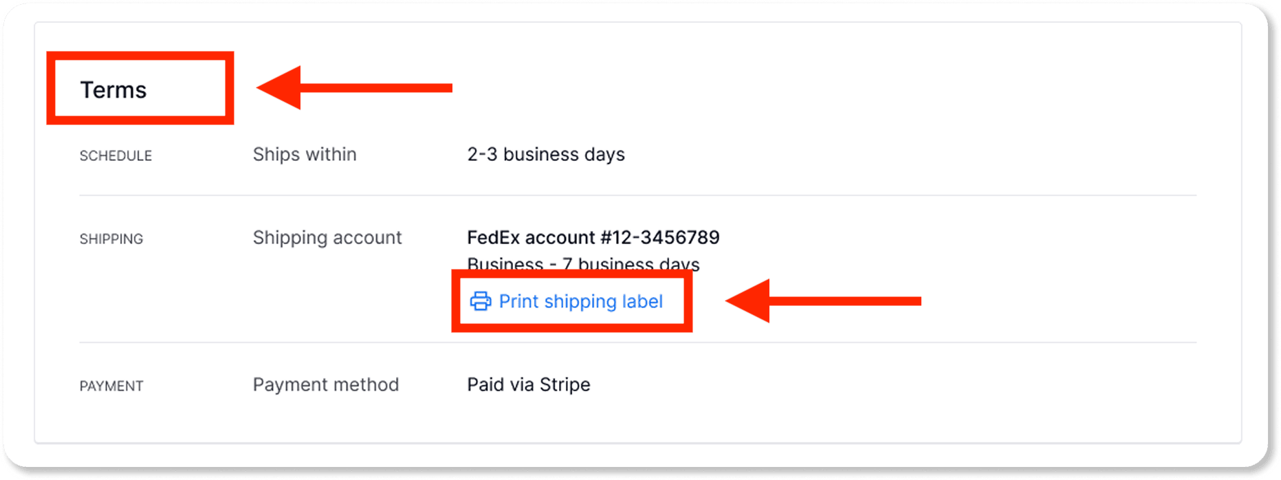 To find your shipping label file, scroll down to the Terms section, on the Order details tab.