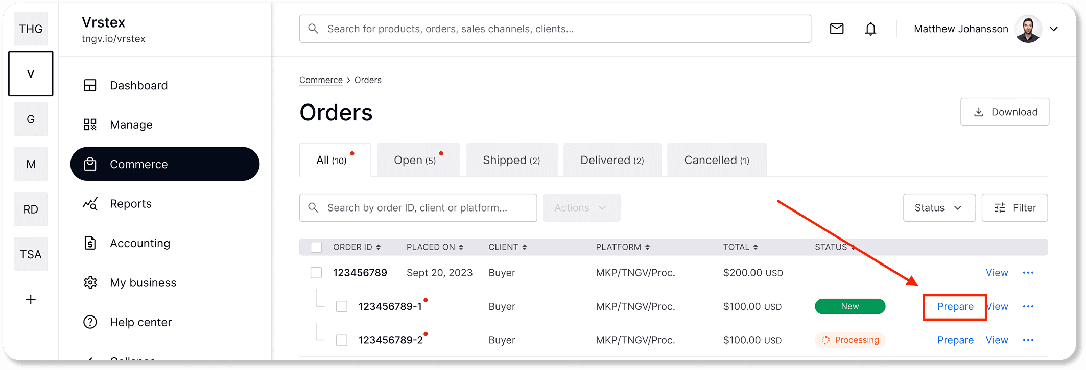 Select the order you want to prepare by clicking on ''Prepare".
