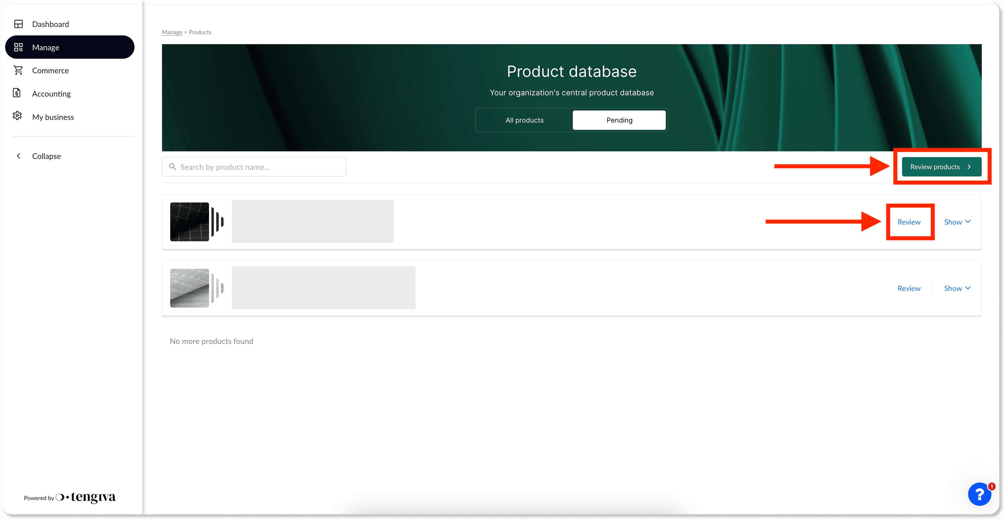 Click “Review products” at the top right to open all pending items, or use “Review” next to a specific product.