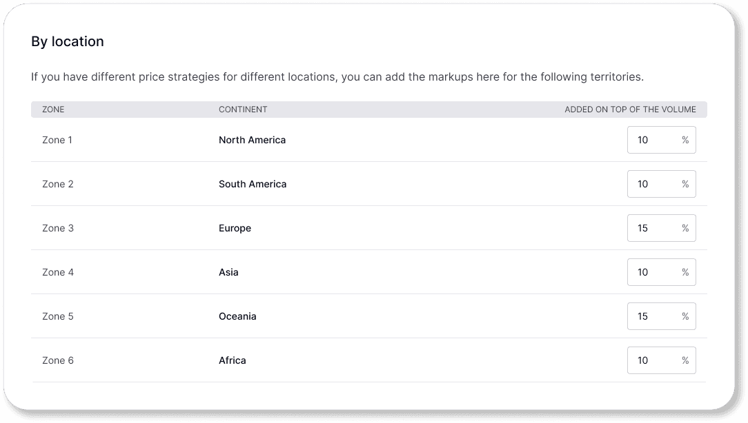 If you have different price strategies for different locations, you can add the markups here to apply them to specific territories.